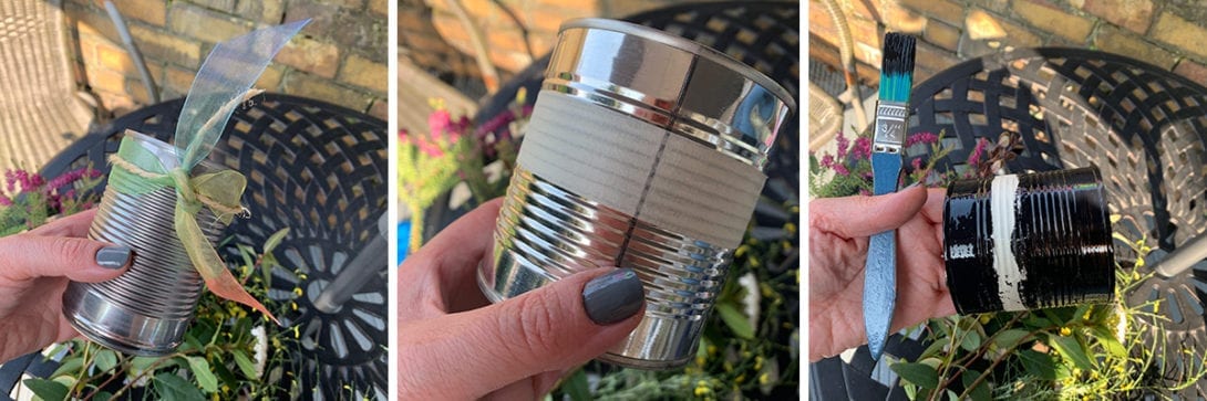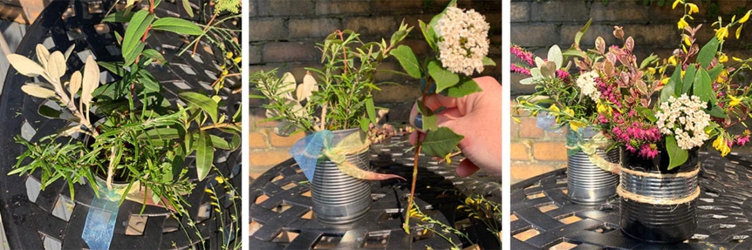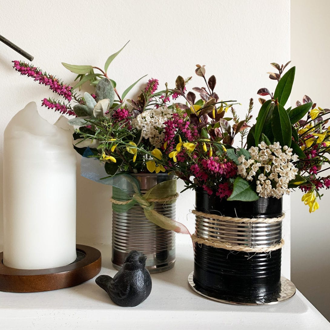 You can pretty-up your lockdown living space with simple spring flowers and foliage from the garden. We’re guessing you have a few tins in your recycling, which you can customise to make vases.