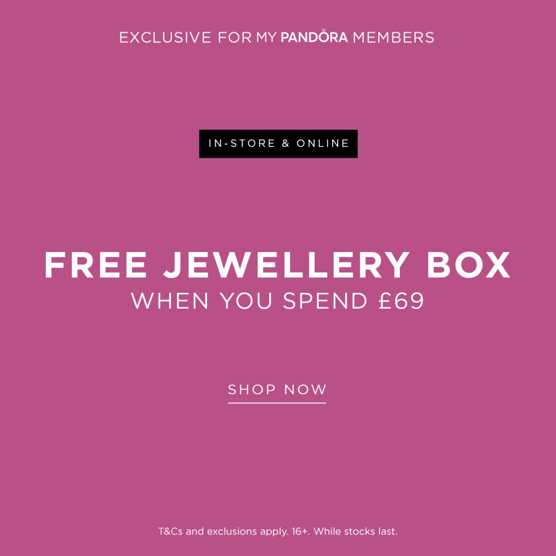 Get a FREE Jewellery Box when you spend £69 or more at Pandora. T&Cs Apply.